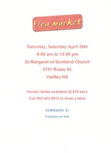 Flea Market April 25, 9:00 am to 12:00 pm.